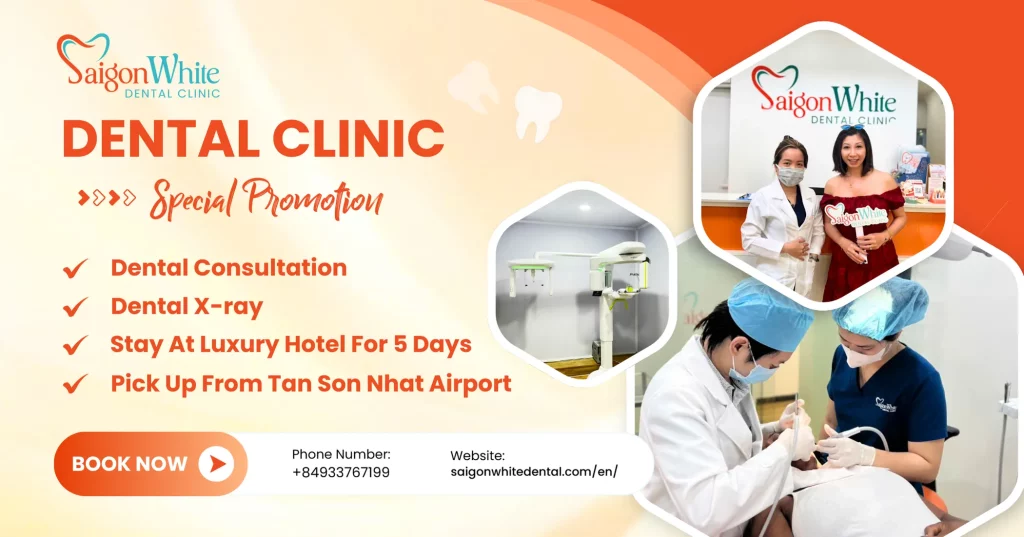 | SAIGON WHITE DENTAL CLINIC offers a special combo worth up to 10,000,000 VND for customers undergoing full-mouth dental implant treatment. | Free dental check-ups, consultation, and Cleaning Free dental X-ray Free airport pick-up from Tan Son Nhat Airport Free first taxi ride from hotel to clinic (within a 10km radius, applicable for customers with a prior appointment) Free 3-day stay at a luxurious and comfortable hotel Extra 5% discount for groups of 2 or more people | |