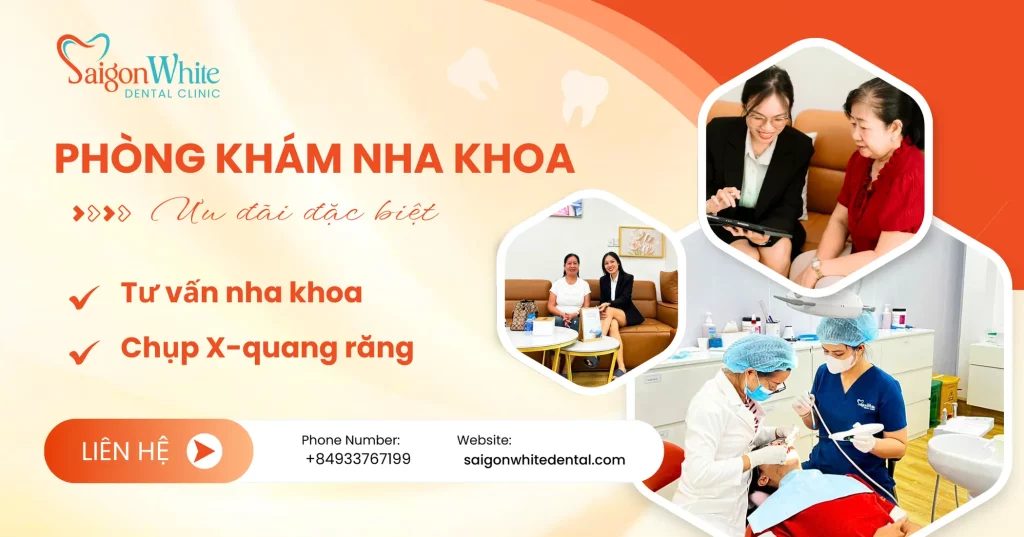 | NHA KHOA SÀI GÒN WHITE tặng combo giá trị lên đến 10,000,000đ cho khách hàng quyết định tiến hành làm từ 10 răng sứ trở lên | Miễn phí Gói thăm khám, tư vấn, vệ sinh răng Miễn phí chụp phim Miễn phí đón khách tại sân bay Tân Sơn Nhất Miễn phí chuyến taxi đầu tiên từ khách sạn đến phòng khám trong bán kính 10km (Áp dụng cho khách hàng đã đặt lịch hẹn trước). Miễn phí 3 ngày nghỉ dưỡng tại khách sạn sang trọng, tiện nghi Giảm thêm 5% cho nhóm khách hàng đi từ 2 người trở lên | |